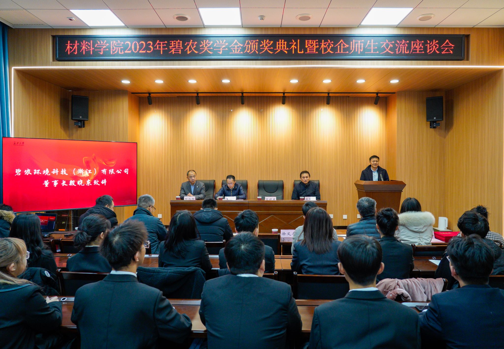 為進一步深化資助育人成效,激勵廣大受助學生奮發自強、立志成才、感恩奉獻,12月21日上午,材料科學與工程學院于北校區致遠大廈三層報告廳舉行2023年碧農社會獎學金頒獎典禮暨校企師生交流座談會。捐資助學企業碧農環境科技(浙江)有限公司董事長殷曉東、行政總監唐天勇,我校社會合作處副處長邱旭輝、資助中心主任歐陽韜、學院院長肖月、副院長徐義庫、對外合作交流中心主任齊琳、成型及控制工程系周亮、學生工作辦公室主任楊樹等教師代表、各年級學生代表參加典禮。典禮由學院黨委副書記張曉琳主持。