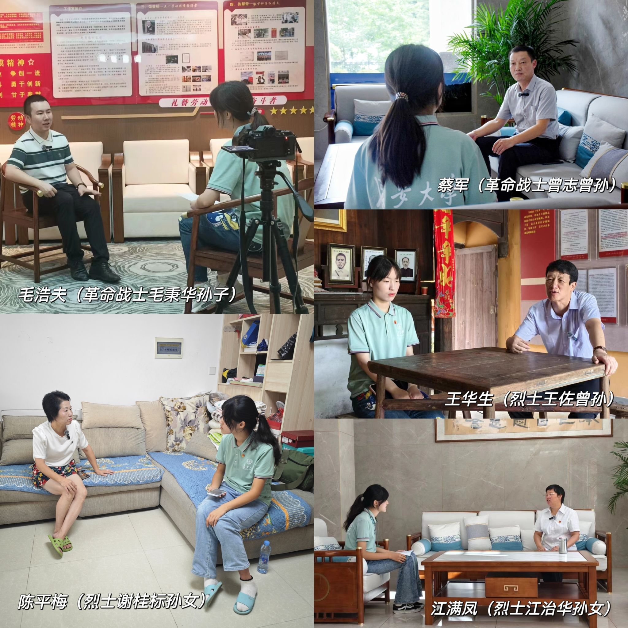 專訪革命后代,傳承紅色基因。為深入挖掘井岡故事、傳承紅色基因,7月19日至22日,實踐隊成員分別對江滿鳳(革命烈士江治華后人)、蔡軍(革命戰(zhàn)士曾志的曾孫)、毛浩夫(革命戰(zhàn)士毛秉華孫子)、王華生(烈士王佐曾孫)、陳平梅(烈士謝桂標孫女)五位革命后代進行專訪,收集他們回憶革命前輩們工作、生活、戰(zhàn)斗情況的口述史資料,攝制眾多珍貴影像資料。