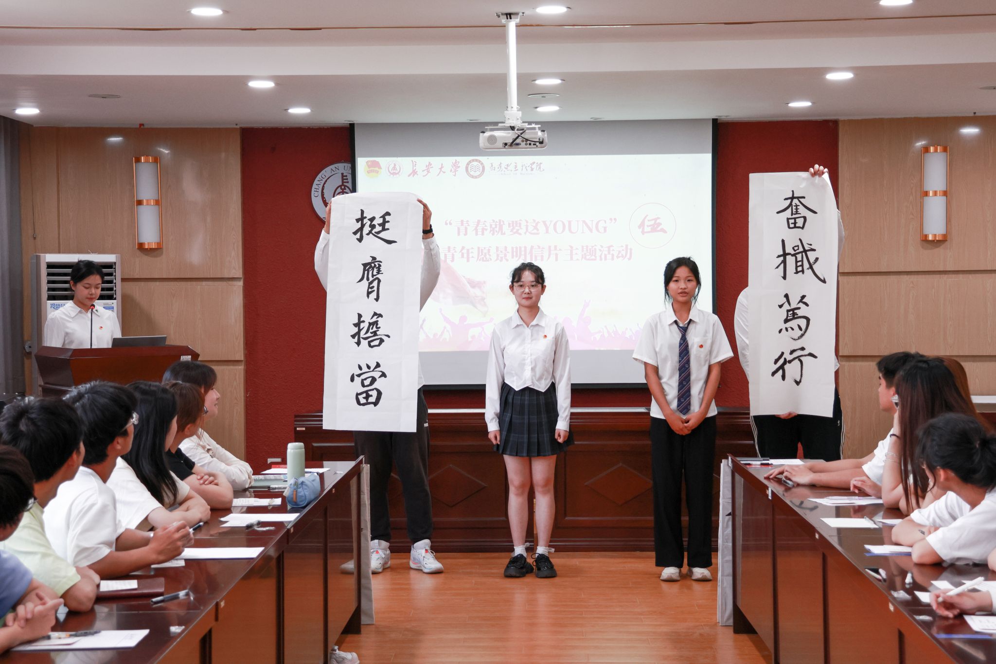 團日活動在精彩的“舉五四火炬,爭時代先鋒”主題影視作品配音演繹中拉開帷幕,支部成員通過細致入微的劇情表演將全體參會人員的思緒帶回那段崢嶸歲月中的史海鉤沉。在《青春中國》朗誦展示環節中,同學們用鏗鏘有力的話語帶領觀眾回首五四運動以來一代代青年人與祖國共同成長的偉大征程。全體成員開展“青春就要這YOUNG”青年愿景明信片主題活動,在場的各位同學在明信片上寫下自己的青春抱負和對偉大祖國最真摯的祝福。團支部成員趙楚涵、岑瑤共同用書法寫下“挺膺擔當 奮楫篤行”八個大字并分享創作感受。