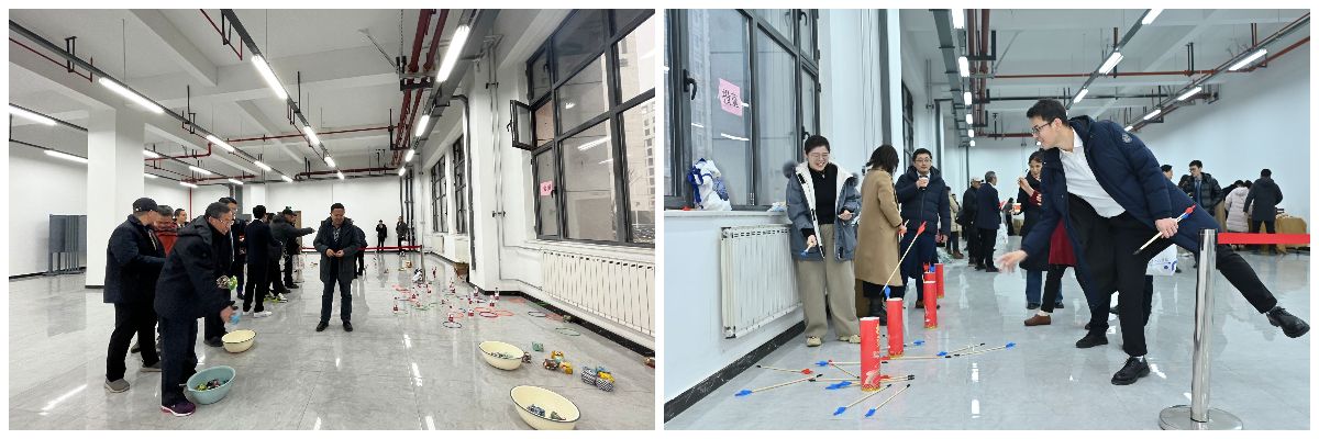 聯歡會前,教職工進行游園活動,參與丟沙包、投壺、套圈、踢毽子、夾乒乓球等娛樂活動。