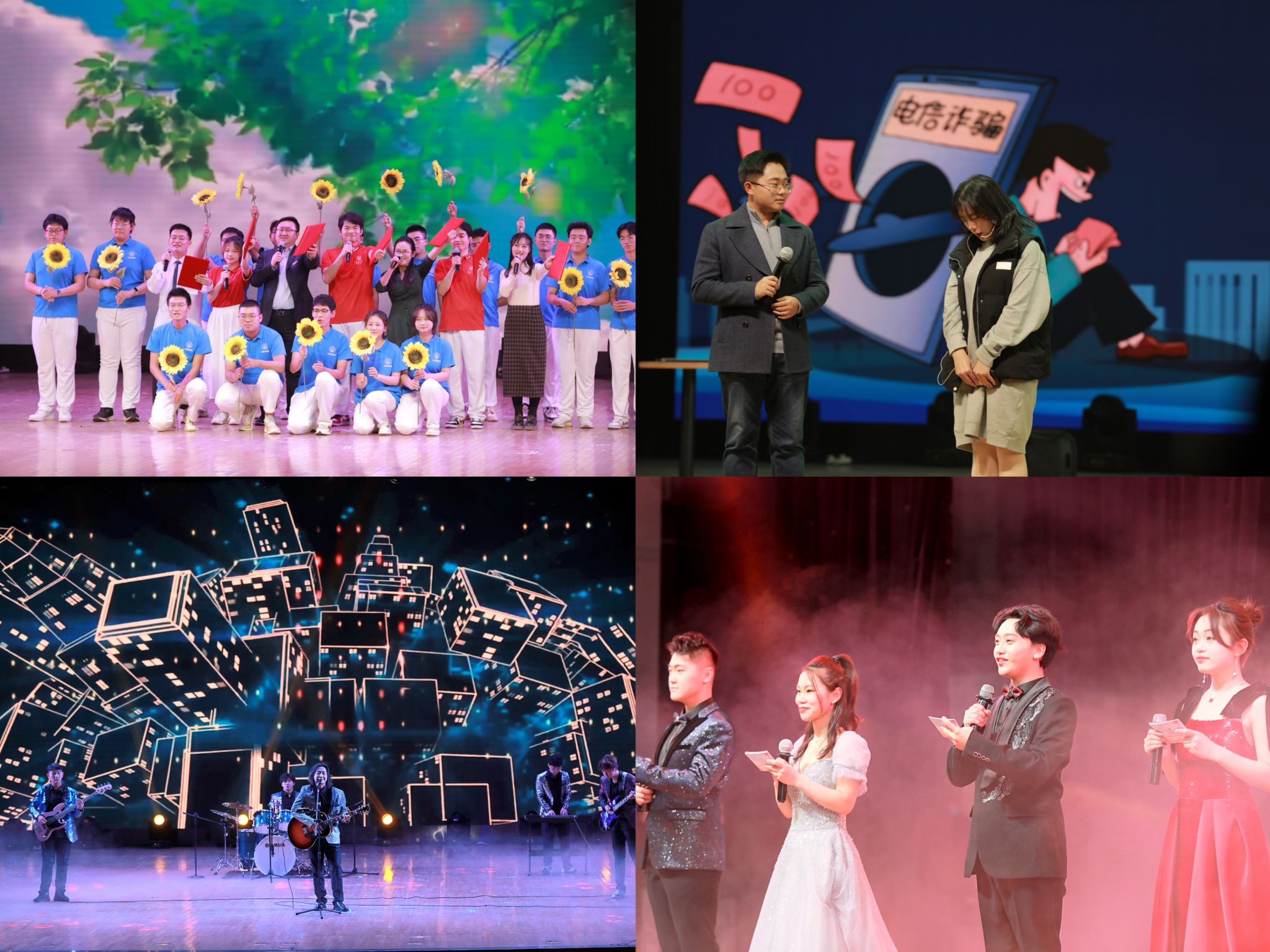 晚會節(jié)目異彩紛呈,氣氛熱烈,處處洋溢著青春活力。在學(xué)院冬夏啟動器樂隊(duì)動感地音樂中晚會拉開帷幕;歌伴舞《第一天》、《一路生花》、《奔跑的青春》悠揚(yáng)的歌聲、動感的舞步展現(xiàn)了學(xué)子們奔向未來的青春姿態(tài);小品《環(huán)環(huán)相扣》寓教于樂,宣傳防范電信網(wǎng)絡(luò)詐騙知識;合唱《夜空中最亮的星》鼓勵同學(xué)們勇敢追逐心中的夢想;優(yōu)美的民俗舞《剪花娘子》展現(xiàn)著中華傳統(tǒng)民間文化的絢爛多姿;朗誦《奉獻(xiàn)的青春》師生共同演繹投身志愿服務(wù)的青年力量,將晚會氣氛推向高潮;最后,晚會在大合唱《仰望星空》中落下帷幕。