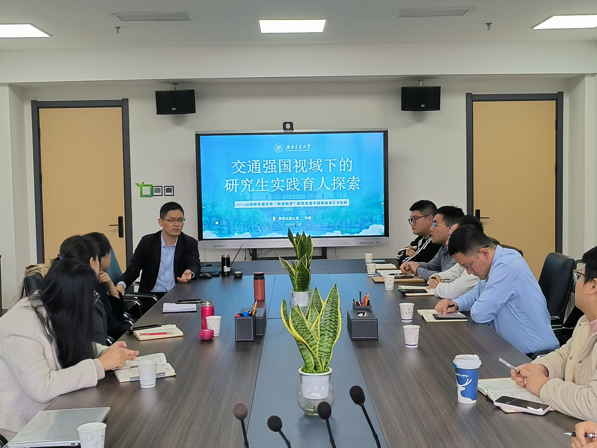 為進一步學習貫徹習近平新時代中國特色社會主義思想和全國教育大會精神,全面貫徹黨的教育方針,落實立德樹人根本任務,11月11日上午,西南交通大學茅以升學院黨總支書記李毅來我校就“交通強國視域下的研究生實踐育人探索”進行工作培訓交流,研究生工作部全體成員、相關學院黨委副書記、學辦主任、研究生輔導員20余人參加。
