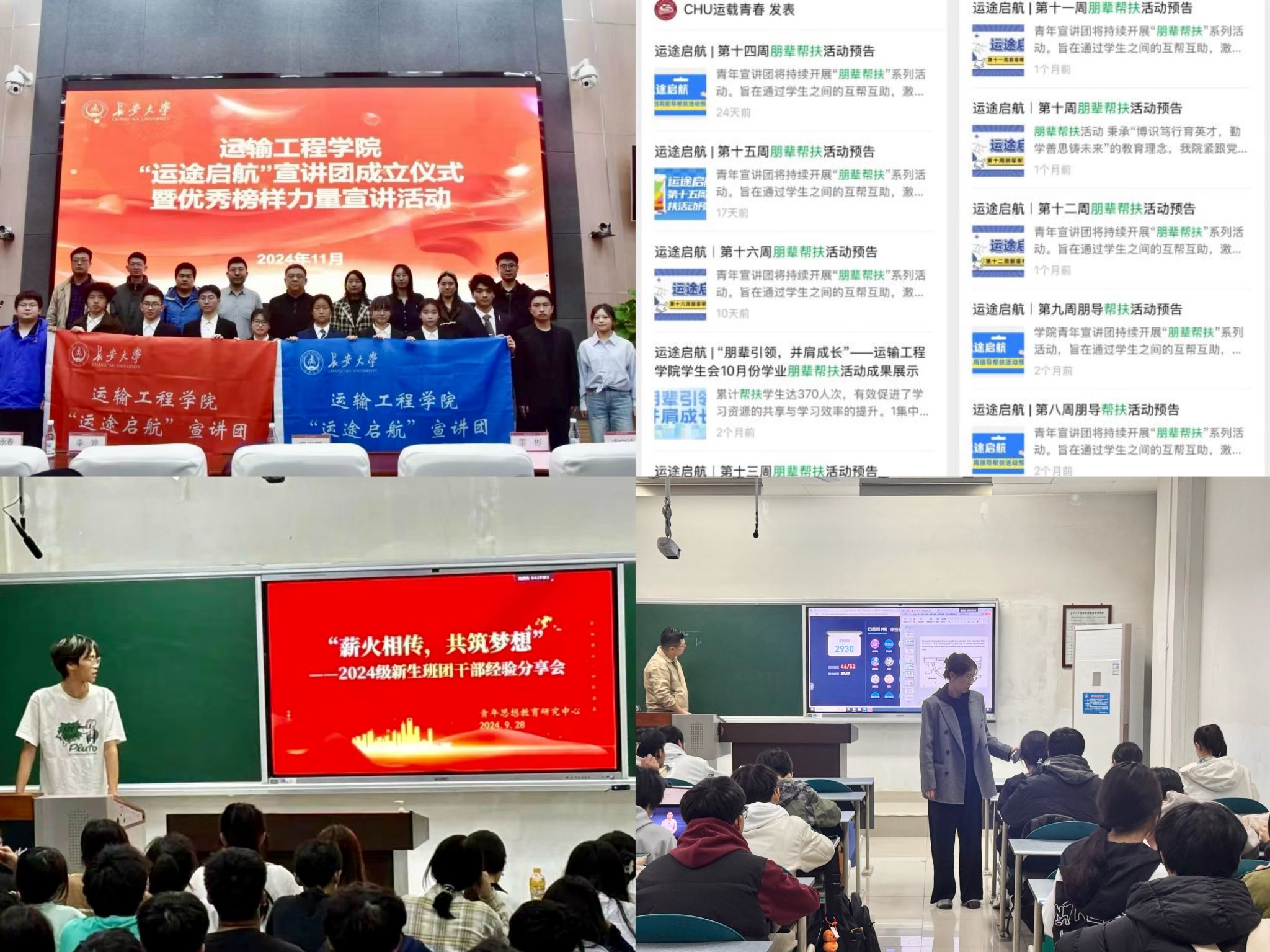 樹榜樣,精準幫扶培養優良學風。新生入學前,學院精心選拔,為2024級每班配備兩名朋輩導師,強化榜樣示范引領作用;學院“運途啟航”宣講團面向新生開展保研經驗分享會、優秀榜樣宣講活動,并通過學院“CHU運載青春”微信公眾號每周發布朋輩幫扶活動預告,激發新生學習熱情,營造形成“學先進、趕先進、爭先進”的創先爭優濃厚氛圍;通過“薪火相傳,共筑夢想”2024級班團干部交流會,邀請高年級優秀學生干部圍繞學業、實踐和班級管理等方面開展深入分享,用好“傳幫帶”助力新生班團干部成長進步;組織“誠信考試,以信取勝”考風考紀警示教育活動,輔導員深入學生課堂查課,以查促學,培育優良學風。
