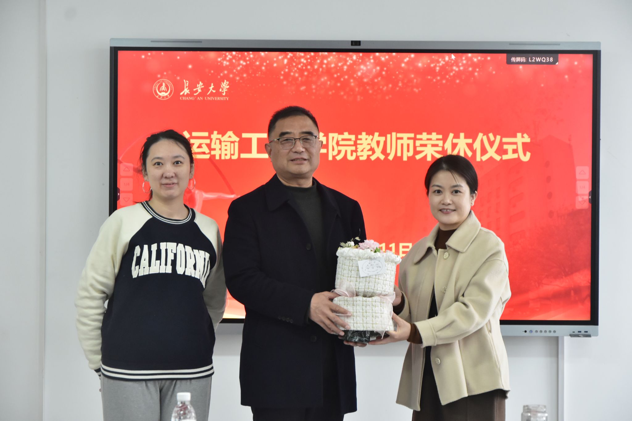 院工會主席徐婷,教師代表、交通工程系黨支部書記張敏為田新民贈送鮮花和紀念品。