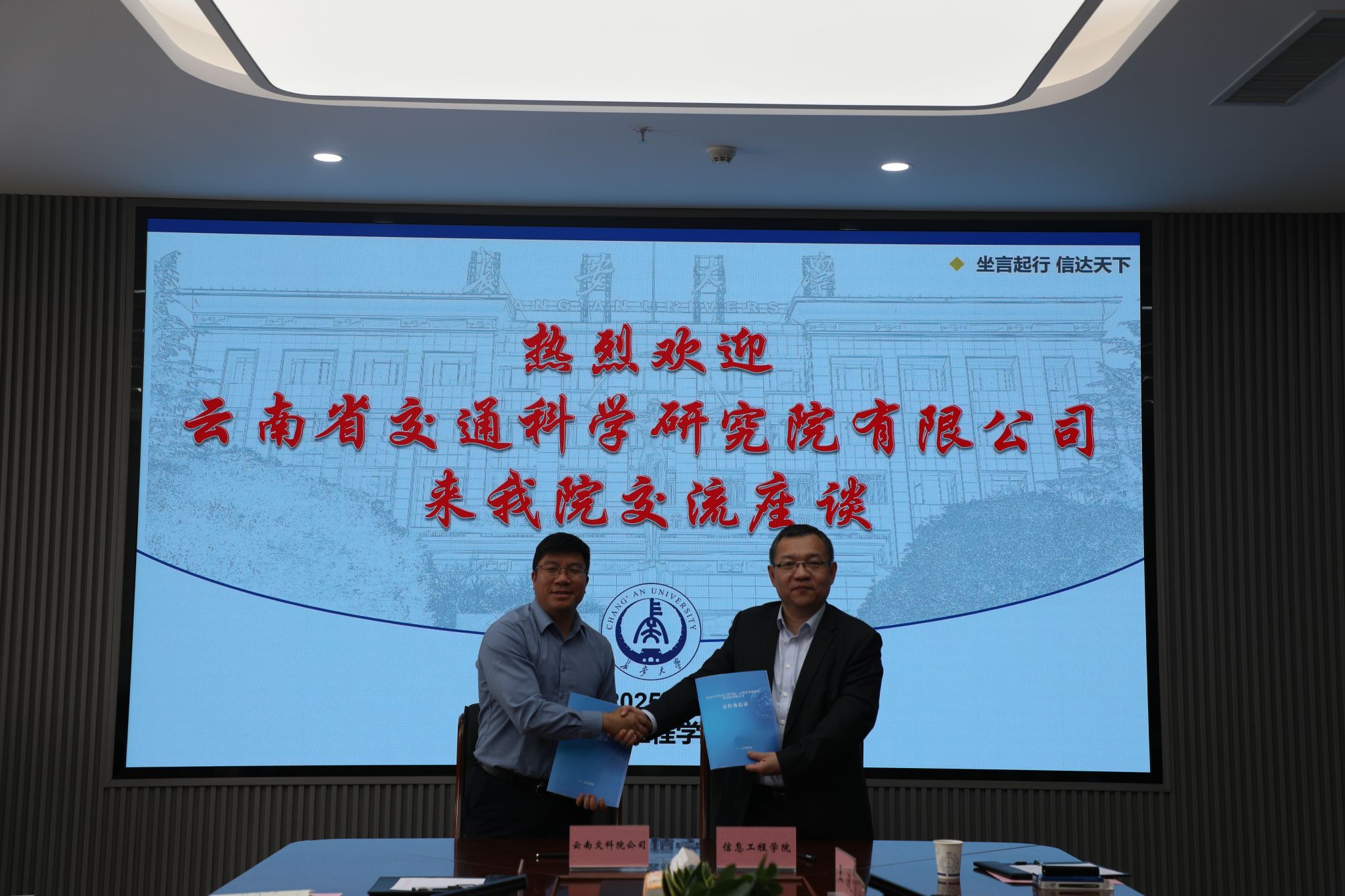 4月11日上午,云南省交通科學研究院有限公司黨委書記、董事長張開文率隊到訪信息工程學院,雙方圍繞智慧交通領域開展產學研合作洽談,并簽署合作備忘錄,共同為“云南交投交科院智慧交通異地研發中心”揭牌。信息工程學院黨委書記陳俊鵬、院長安毅生等領導班子成員和相關系部室主任出席活動。會議由安毅生主持。