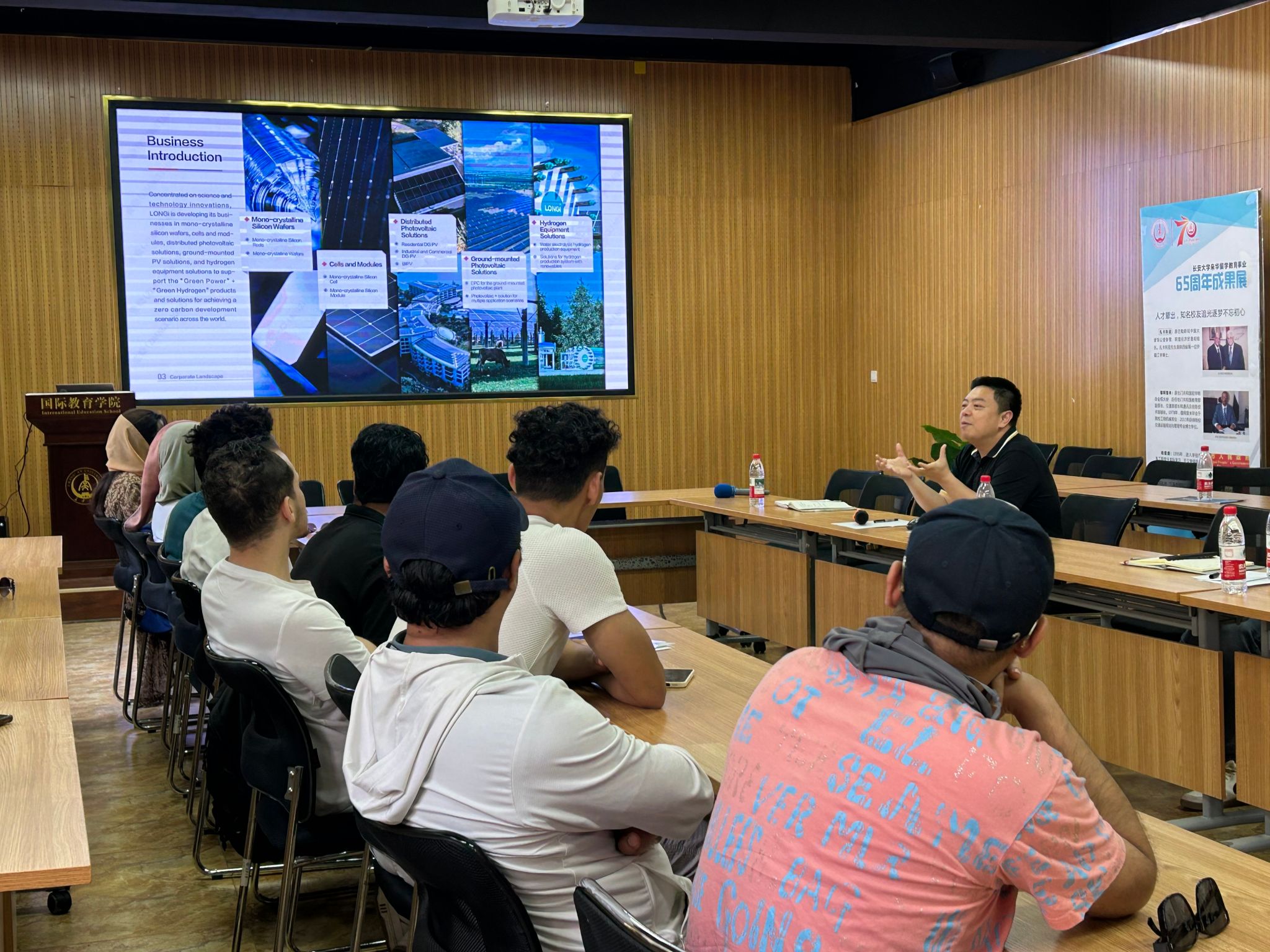 張研表示,在全球碳中和進程加速推進的時代背景下,綠色產業的創新發展已成為推動世界經濟綠色轉型的核心引擎,材料學院長期致力于培養兼具專業素養與跨文化勝任力的國際化人才,希望通過與隆基綠能的深入交流,加強學生對未來職業規劃的清晰認識。戴堅向與會留學生系統介紹了隆基綠能以科技創新驅動全球能源轉型的戰略背景,強調了國際化戰略是公司發展的核心定位,并期待整合全球智慧資源,共同推進“Solar for Solar”零碳發展目標。