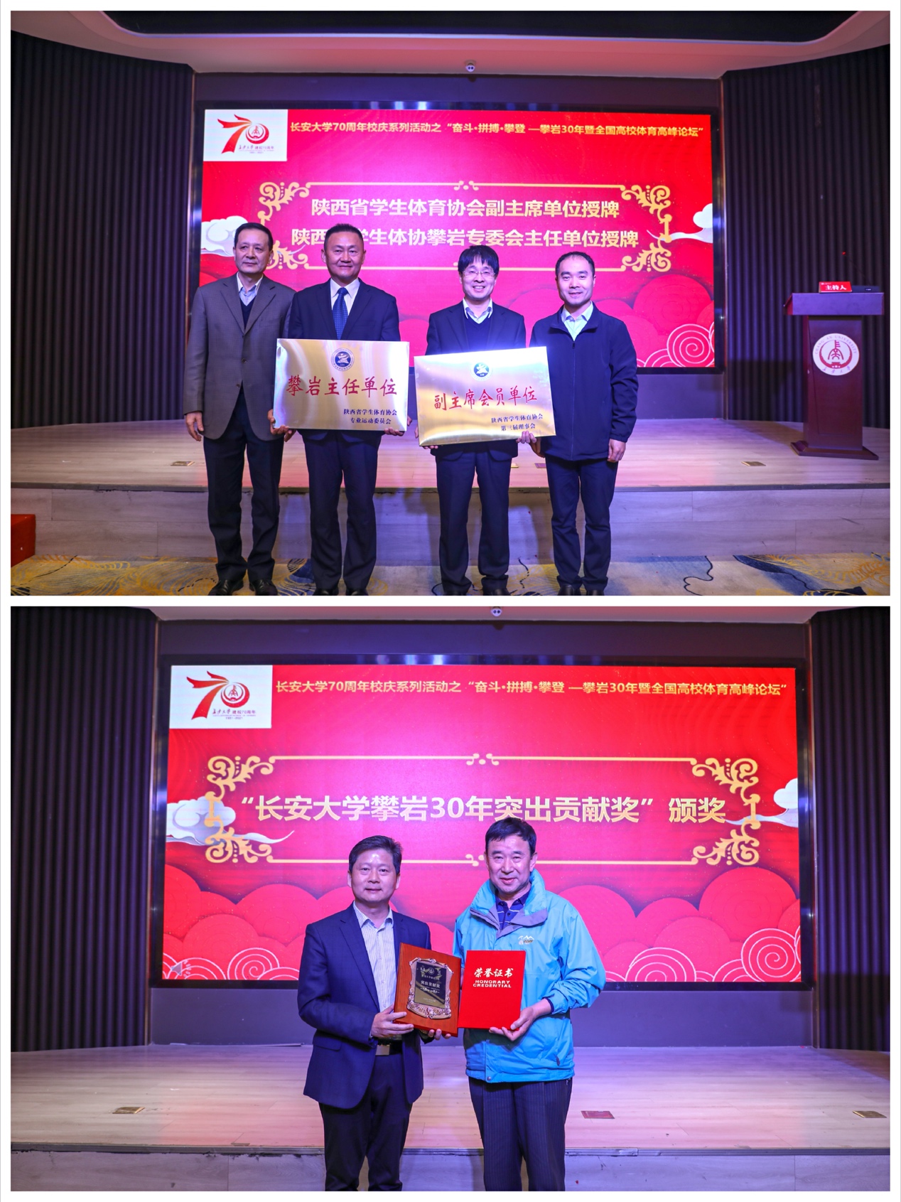 隨后舉行了授牌與頒獎儀式。授予我校“陜西省學生體育協會副主席單位”及“陜西省學生體育協會攀巖運動專業委員會主任單位”,為我校師長青老師頒發“長安大學攀巖30年突出貢獻獎”。