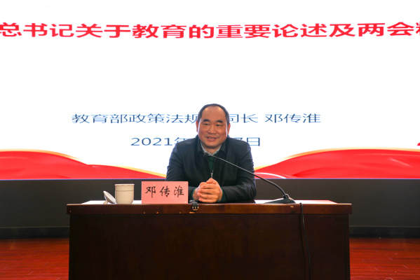 4月27日,我校在北校區會議中心報告廳召開校黨委理論學習中心組(擴大)會議,邀請教育部政策法規司司長鄧傳淮作習近平總書記關于教育的重要論述及兩會精神專題報告。報告會由校黨委書記陳志堅主持。