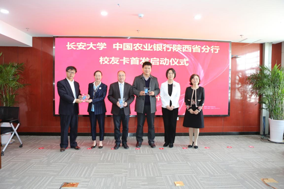 長安大學校友卡首發儀式啟動,中國農業銀行信用卡中心總裁薛亞芹、陜西省分行副行長韓欣、長安大學校友總會秘書長鄧云潮為校友頒發校友卡。