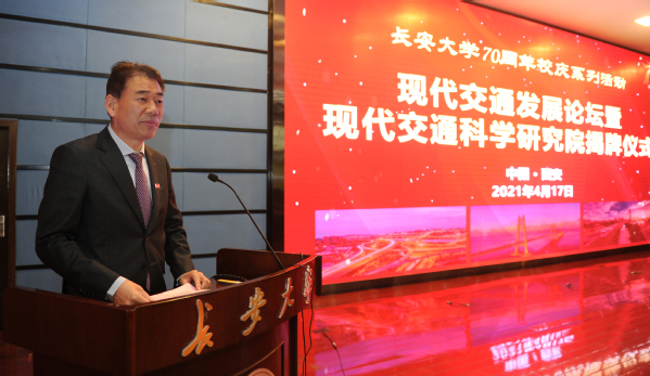 4月17日,長安大學現代交通發展論壇暨現代交通科學研究院揭牌儀式在北校區舉行。陜西省交通廳黨組成員、副廳長、我校校友丁勝仁,青海省人大常委會原秘書長、辦公廳主任、我校校友蔡德貴,交通運輸部原總工程師、我校校友周偉,青海省交通運輸廳黨組成員、副廳長、我校校友王永祥,新加坡工程院院士Fwa TienFang,港珠澳大橋管理局總工程、我校校友師蘇權科,北京交通大學賈利民教授,校黨委副書記副校長彪曉紅出席儀式。會議由副校長賀拴海主持。