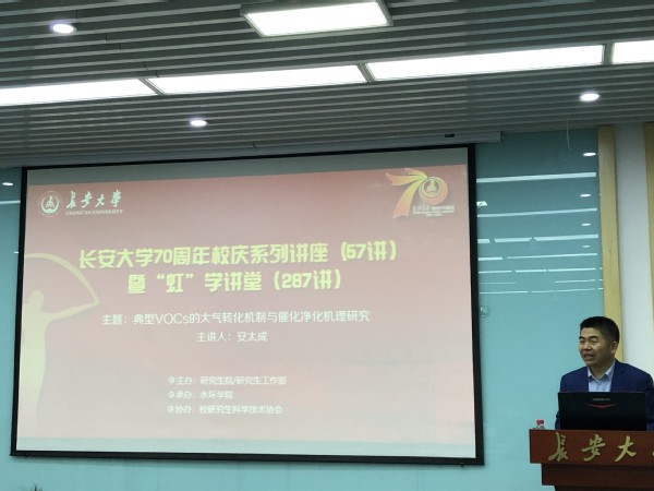 4月11日上午,由研究生院/研究生工作部主辦、水利與環境學院承辦、校研究生科學技術協會協辦的長安大學70周年校慶系列講座(57講)暨“虹”學講堂(287講)在南校區東院研究生學術創新活動中心第一報告廳順利舉辦。廣東工業大學安太成教授作了題為“典型VOCs的大氣轉化機制及其催化凈化機理研究”的報告,本次報告由水環學院王其召教授主持,我校相關學院共計130余名師生參加了此次講座。
