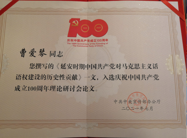 這次理論研討會,是中國共產黨成立100周年慶祝活動的一項重要內容。年初,教育部辦公廳面向部屬各高等學校發布征稿通知,我校社科處認真組織動員,擇優推薦了曹愛琴副教授撰寫的《延安時期中國共產黨對馬克思主義話語權建設的歷史性貢獻》一文。經教育部評審,該文作為從200多篇征稿中脫穎而出的8篇論文之一,被教育部推薦入選《慶祝中國共產黨成立100周年理論研討會論文集》(學習出版社出版)。