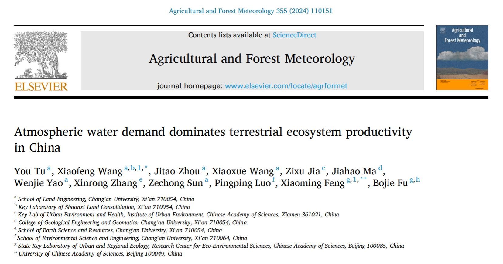 論文信息:You Tu, Xiaofeng Wang*, Jitao Zhou, Xiaoxue Wang, Zixu Jia, Jiahao Ma, Wenjie Yao, Xinrong Zhang, Zechong Sun, Pingping Luo, Xiaoming Feng*, Bojie Fu. (2024). Atmospheric water demand dominates terrestrial ecosystem productivity in China. Agricultural and Forest Meteorology, 355, 110151.