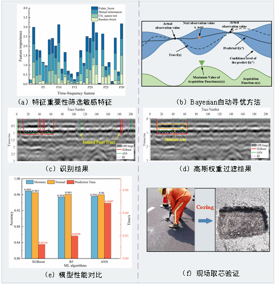 針對探地雷達(GPR)數(shù)據(jù)解譯依賴人工經(jīng)驗判斷而存在主觀性和低效率的問題,該研究提出了結(jié)合水損害敏感特征和機器學(xué)習(xí)算法的水損害自動識別方法。利用正反演及現(xiàn)場實驗建立水損害數(shù)據(jù)集,采用先進的機器學(xué)習(xí)算法XGBoost和貝葉斯自動尋優(yōu)方法建了水損害分類識別的高精度模型,為瀝青路面的精準養(yǎng)護提供了科學(xué)依據(jù)。