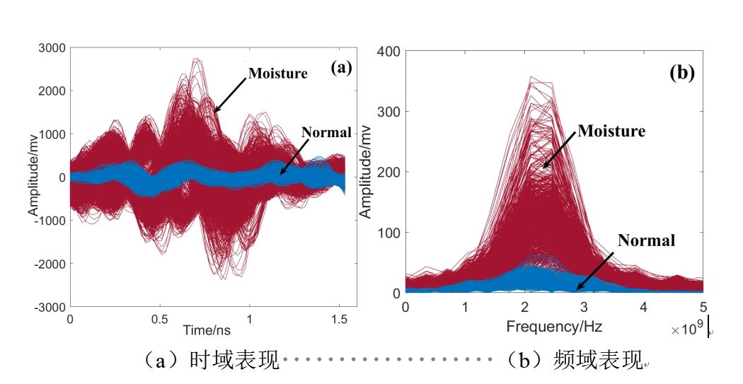 該研究首先通過正演模擬、室內(nèi)實驗和現(xiàn)場試驗對比分析了水損害和正常路面在時頻域特征的表現(xiàn),發(fā)現(xiàn)有分類效果但存在重疊現(xiàn)象,如下圖所示。
