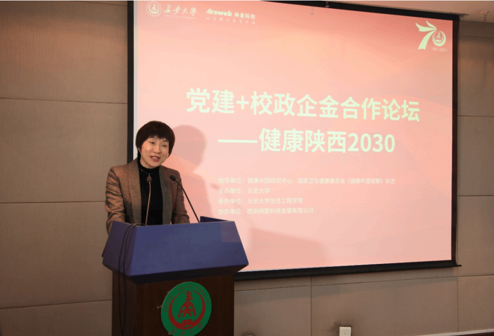 本次論壇由健康中國研究中心、國家衛(wèi)生健康委《健康中國觀察》雜志社指導、長安大學主辦、長安大學信息工程學院承辦、西安網(wǎng)是科技發(fā)展有限公司協(xié)辦。論壇以“健康陜西2030”為主題。長安大學副校長趙祥模、國家衛(wèi)生健康委《健康中國觀察》雜志副社長王永進、陜西省衛(wèi)生健康委員會黨組成員劉亞軍、中國建設銀行陜西省分行副行長王文莉、西部證券股份有限公司副總經(jīng)理范江峰、西安網(wǎng)是科技發(fā)展有限公司總經(jīng)理馬航昌、西安交通大學人文社會科學學院黨委書記許佳輝、長安大學信息工程學院黨委書記胡予欣、院長安毅生及學院全體領導、地市衛(wèi)生健康委員會代表、區(qū)縣衛(wèi)生健康局代表、相關企業(yè)、金融機構代表出席了會議。論壇由長安大學信息工程學院黨委書記胡予欣主持。