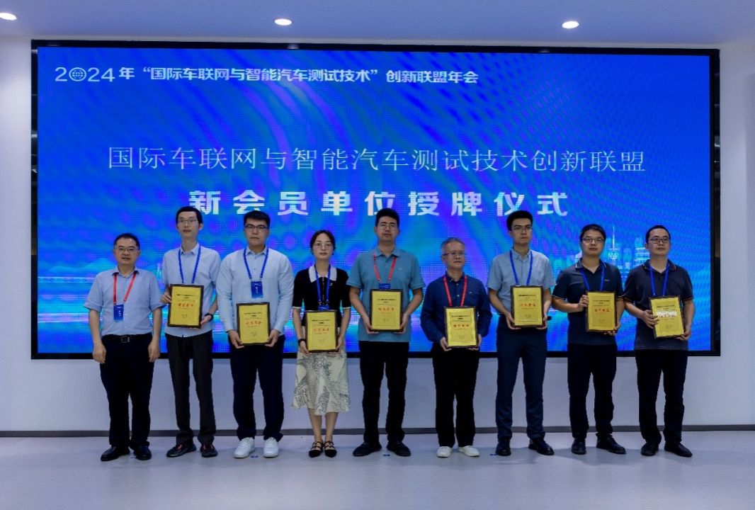 “國際車聯網與智能汽車測試技術創新聯盟”理事長、長安大學趙祥模教授為2024年聯盟新會員吉林大學、中南大學、河北高速公路集團、質子汽車等15家單位進行了授牌。