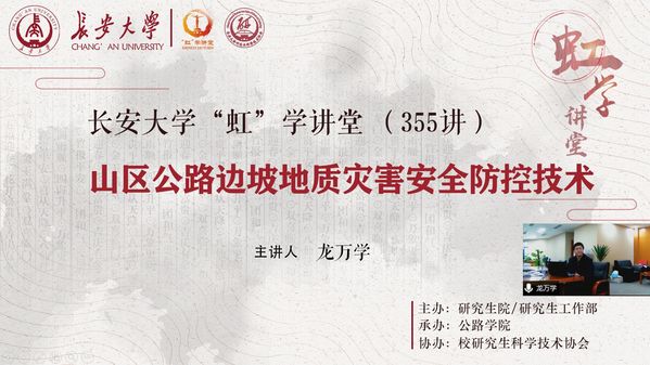 4月1日下午,由研究生院/研究生工作部主辦、公路學院承辦、校研究生科學技術協會協辦的“虹”學講堂第355講以線上講座形式舉行。貴州省交通規劃勘察設計研究院龍萬學研究員作了題為“山區公路邊坡地質災害安全防控技術”的報告,相關學院共400余名師生參加講座。