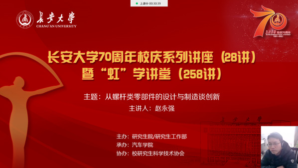 2月20日下午,由研究生院/研究生工作部主辦、汽車學(xué)院承辦、校研究生科學(xué)技術(shù)協(xié)會協(xié)辦的長安大學(xué)70周年校慶系列講座(28講)暨“虹”學(xué)講堂(258講)通過“騰訊課堂”以線上直播形式順利舉辦。陜西理工大學(xué)趙永強教授作了題為“從螺桿類零部件的設(shè)計與制造談創(chuàng)新”的報告,我校相關(guān)學(xué)院共計210余名師生參加了此次線上講座。