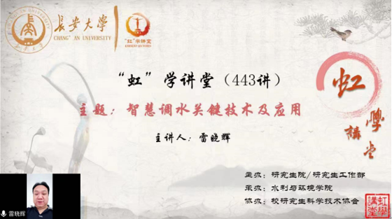 4月11日上午,由研究生院/研究生工作部主辦、水利與環境學院承辦、校研究生科學技術協會協辦的“虹”學講堂第443講以線上線下相結合的形式順利舉辦。中國水利水電科學研究院高級工程師雷曉輝作了題為“智慧調水關鍵技術及應用”的報告,水利與環境學院羅平平教授主持,相關學院共180余名師生參加講座。