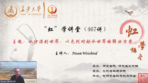 5月31日下午,由研究生院/研究生工作部主辦、水利與環境學院承辦、校研究生科學技術協會協辦的“虹”學講堂第467講以線上線下相結合的形式順利舉辦。扎克伯格水研究所環境水文學教授Noam Weisbrod作了題為“從沙漠到世界:以色列對缺水世界的解決方案”的報告,水利與環境學院羅平平教授主持,相關學院共180余名師生參加講座。