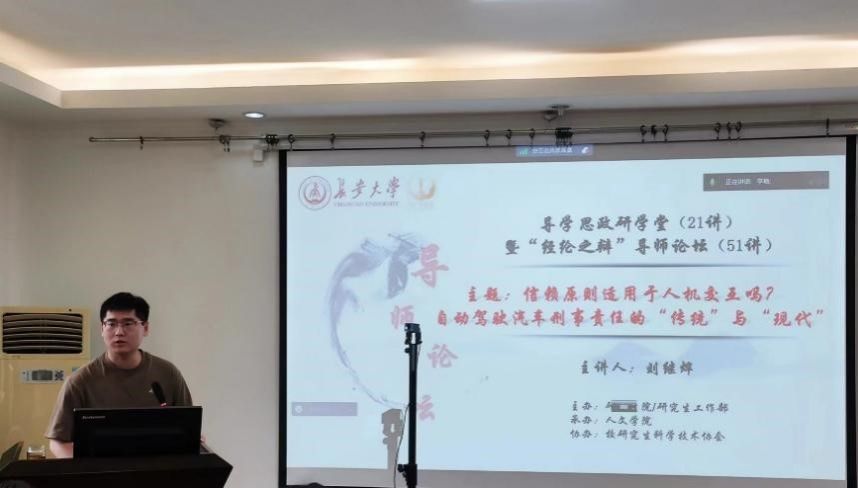 10月11日下午,由研究生院/研究生工作部主辦、人文學院承辦、校研究生科學技術協會協辦的導學思政研學堂第21講暨“經綸之辯”導師論壇第51講在南校區北院基礎課樓412報告廳順利舉辦。長安大學人文學院劉繼燁老師作題為“信賴原則適用于人機交互嗎?自動駕駛汽車刑事責任的‘傳統’與‘現代’”的報告,人文學院陳蓉教授主持報告會,相關學院共100余名師生參加講座。