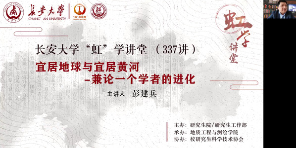 1月1日上午,研究生院/研究生工作部和地測學院聯合舉辦“疫情下的新年,抗疫中的長大--元旦學術大餐(“虹”學講堂337講)”線上主題講座。彭建兵院士應邀為我校師生作了題為《宜居地球與宜居黃河——兼論一個學者的進化》的學術報告。地測學院黨政領導、兄弟院校的學者及來自各學院的1220余名師生聆聽報告。報告會由地測學院院長李振洪主持。