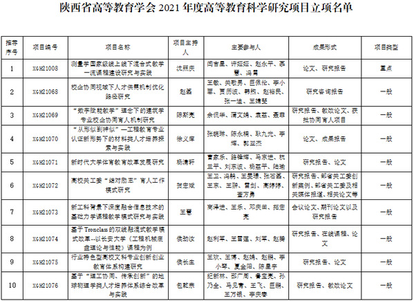 近日,陜西省高等教育學會公布了2021年高等教育科學研究項目立項名單,經學校推薦、學會組織專家評審、網上公示等程序,我校共獲批10項,其中重點項目1項、一般項目9項。
