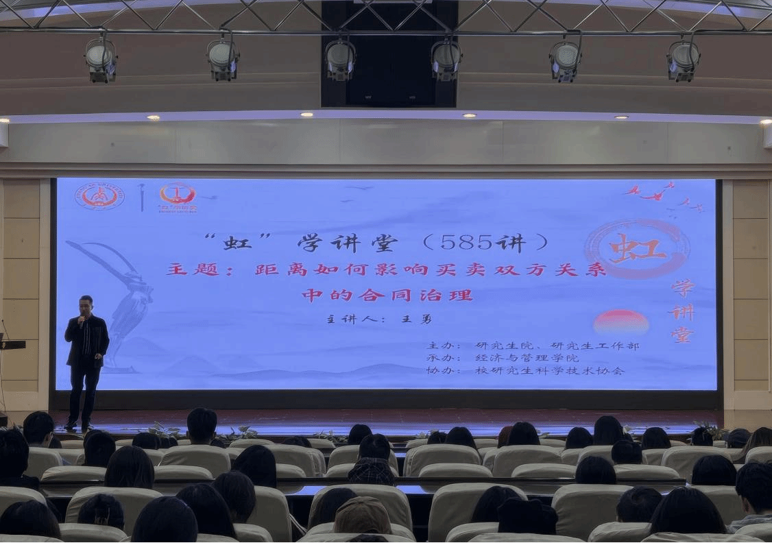 10月21日下午,由研究生院、研究生工作部主辦,經(jīng)濟(jì)與管理學(xué)院承辦,校研究生科學(xué)技術(shù)協(xié)會協(xié)辦的“虹”學(xué)講堂第585講在南校區(qū)本部學(xué)術(shù)交流中心報告廳舉行。西安財經(jīng)大學(xué)王勇教授作題為“距離如何影響買賣雙方關(guān)系中的合同治理”的報告,相關(guān)學(xué)院共270余名師生參加講座。