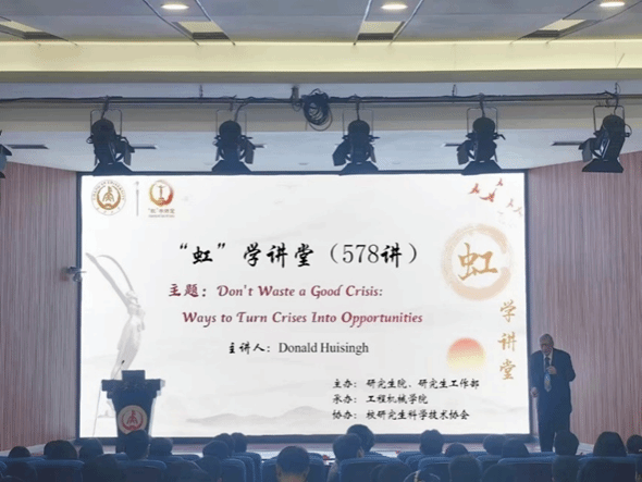 10月9日上午,由研究生院、研究生工作部主辦,工程機械學院承辦,校研究生科學技術協會協辦的“虹”學講堂第578講在南校區東院伯聲報告廳舉行。美國田納西大學Donald Huisingh教授作了題為“Don't Waste a Good Crisis: Ways to Turn Crises Into Opportunities”的報告,工程機械學院呂景祥副教授主持報告會,相關學院共150余名師生參加講座。
