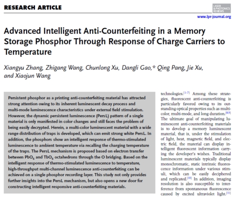 論文信息:X. Zhang, Z. Wang, C. Xu, D. Gao, Q. Pang, J. Xu, X. Wang, Advanced Intelligent Anti-Counterfeiting in A Memory Storage Phosphor through Response of Charge Carriers to Temperature, Laser Photonics Rev. 2024, 2401376.