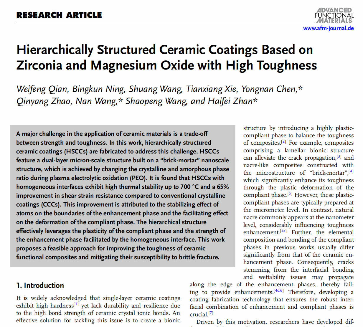 論文信息:W. Qian, B. Ning, S. Wang, T. Xie, Y. Chen, Q. Zhao, N. Wang, S. Wang, H. Zhan, Hierarchically Structured Ceramic Coatings Based on Zirconia and Magnesium Oxide with High Toughness. Adv. Funct. Mater. 2024, 2418312.