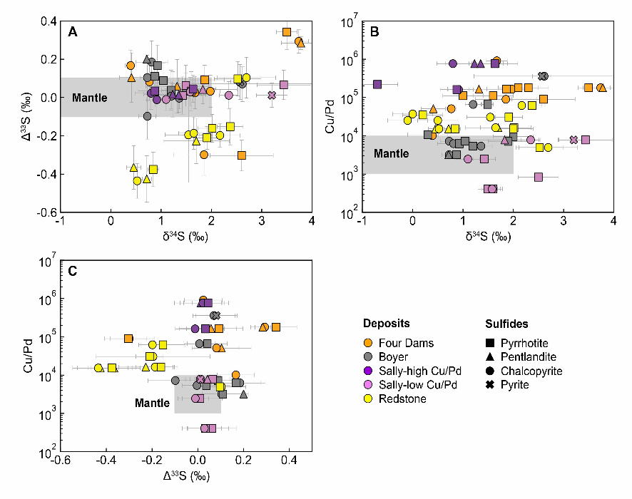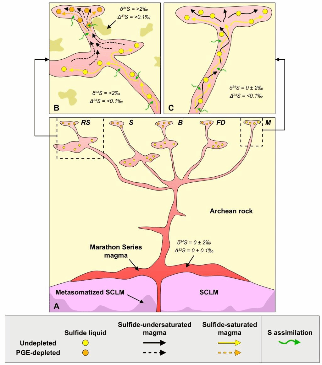 針對這些科學問題,馬修教授領銜的國際銅鎳硫化物礦床研究團隊通過分析北美最大的Coldwell堿性雜巖體東部輝長巖套(圖1)中Cu-Ni-PGE 礦床群的硫同位素組成(δ3?S和Δ33S)以及全巖Cu/Pd比值,發現(圖2):北部礦床的δ3?S值(-0.7‰至3.78‰)和Δ33S值(-0.44‰至0.34‰)顯著偏離地幔范圍(δ3?S=0±2‰,Δ33S=0±0.1‰)。據此,研究團隊提出,(1)北部礦床群中的硫有約20%來自太古代地殼,硫化物經過多期次分離與PGE(鉑族元素)動態再富集;(2)東部Marathon 礦床硫源均來自地幔,深部沒有出現硫化物熔離,巖漿快速上升導致地殼混染極弱(圖3)。本次研究為巖漿通道型礦床中硫同位素的分餾機制及PGE成礦動力學提供了新視角。