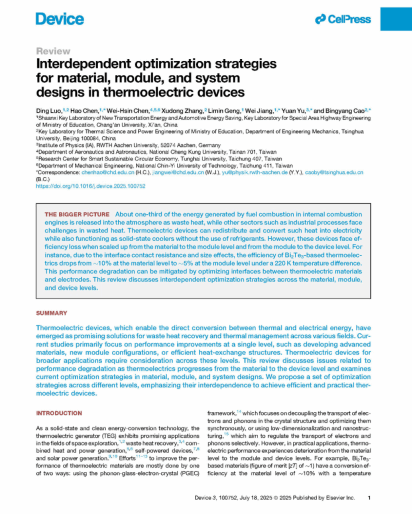 近日,我校能電學院科研團隊在工程技術領域頂級期刊《Device》上發(fā)表了題為《Interdependent optimization strategies for material, module,and system designs in thermoelectric devices》的綜述論文。能電學院羅丁副教授為第一作者,陳昊教授為通訊作者,長安大學為第一署名單位和第一通訊單位。