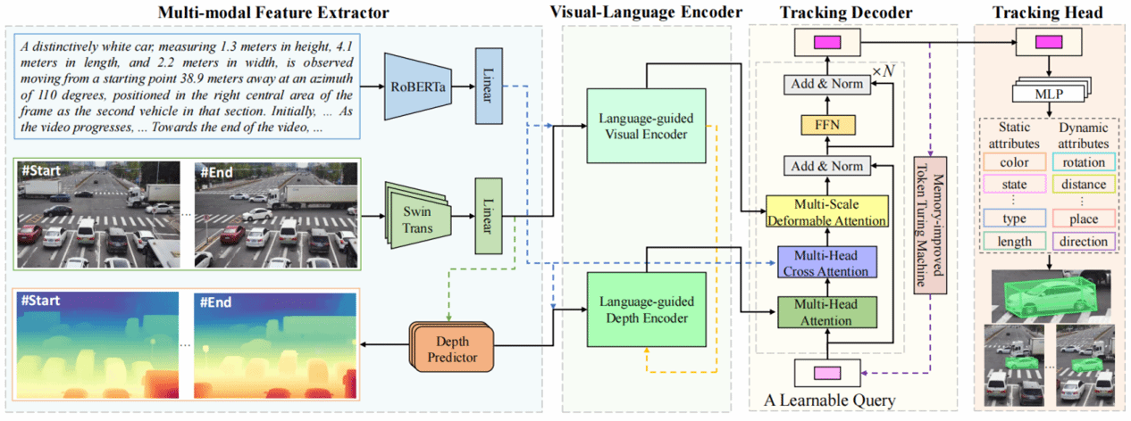 該研究首創單目視頻三維視覺語言跟蹤(Mono3DVLT)研究,突破傳統技術依賴昂貴傳感器及語言融合不足的局限。團隊提出三大創新:定義單目視頻三維視覺語言跟蹤任務范式;構建首個大規模數據集Mono3DVLT-V2X,融合大模型生成與人工標注,提供79,158段含2D/3D標注的自然語言視頻;開發多模態架構模型Mono3DVLT-MT,其創新設計的特征提取與融合機制在自建數據集上建立性能新基準,顯著超越現有方法,為三維視覺語言跟蹤領域提供突破性解決方案。
