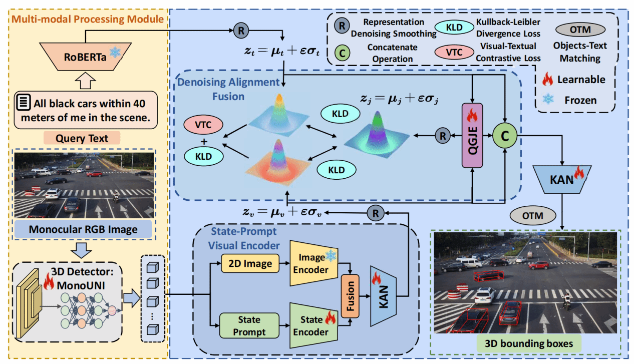 該研究首次聚焦并深入研究了單目視覺下的三維場景理解難題:通過構建具有空間感知能力的視覺-語言聯合表征模型,突破傳統單目視覺系統在復雜場景理解中的維度缺失瓶頸。針對現有方法在跨模態對齊和空間推理方面的不足,研究團隊創新性地提出基于狀態提示的視覺編碼器(SPVE)和去噪對齊融合(DAF)模塊,有效解決了單目圖像深度信息缺失帶來的幾何歧義問題,實現了對多物體三維空間關系的精準定位。實驗表明,該方法在自建的MonoMulti3D-ROPE數據集上相比現有最優模型提升顯著,平均定位精度達到72.3%,較基線方法提升19.6個百分點。