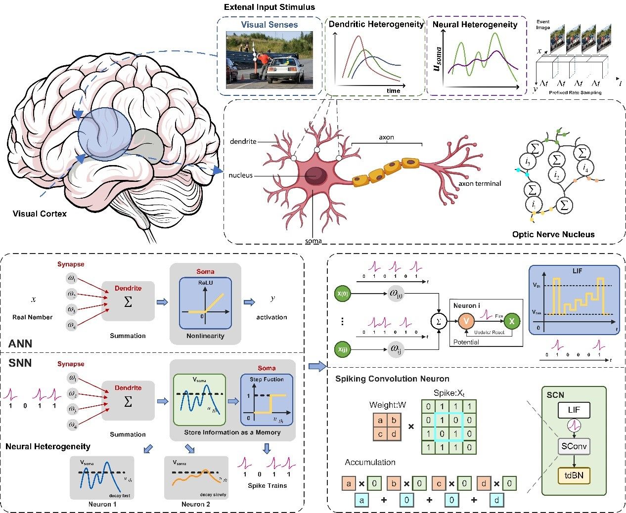 視覺刺激圖解與可訓練神經元模型SCN示意圖